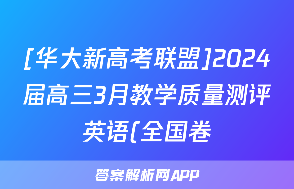 [华大新高考联盟]2024届高三3月教学质量测评英语(全国卷)试题正在持续更新,目前2024届最新高考模拟示范卷答案网为大家整理了相关试题及答案,供大家查缺补漏,高效提升成绩。