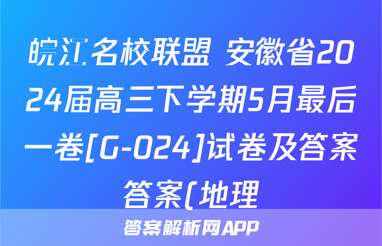 皖江名校联盟 安徽省2024届高三下学期5月最后一卷[G-024]试卷及答案答案(地理)正在持续更新,目前2024届最新高考模拟示范卷答案网为大家整理了相关试题及答案,供大家查缺补漏,高效提升成绩。