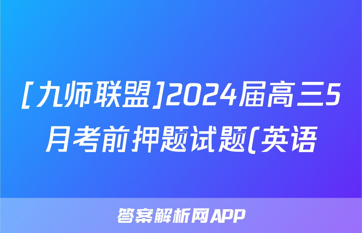 [九师联盟]2024届高三5月考前押题试题(英语)正在持续更新,目前2024届最新高考模拟示范卷答案网为大家整理了相关试题及答案,供大家查缺补漏,高效提升成绩。