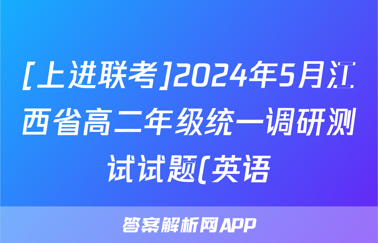[上进联考]2024年5月江西省高二年级统一调研测试试题(英语)正在持续更新,目前2024届最新高考模拟示范卷答案网为大家整理了相关试题及答案,供大家查缺补漏,高效提升成绩。
